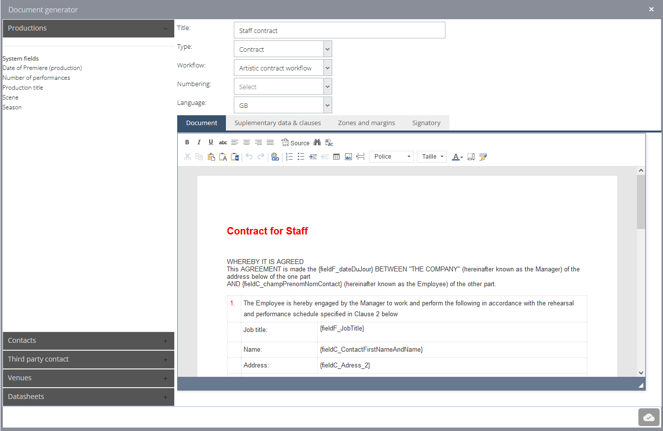 Artists, casual or permanent staff, contributors: issue contracts of any type from your own templates library.