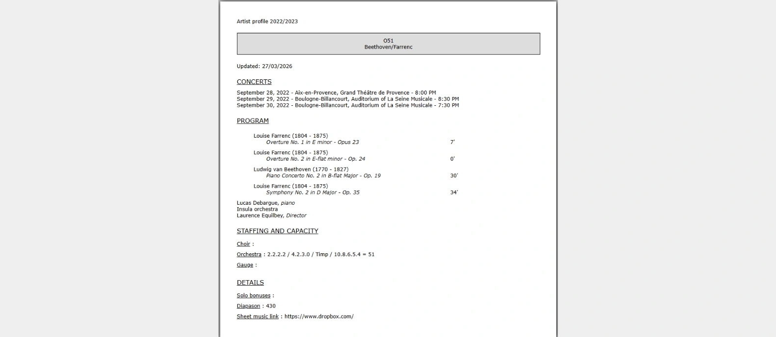 With #DIESE, centralize your repertoire of works and productions, manage your programs, and streamline recruitment with powerful instrumentation and casting tools.